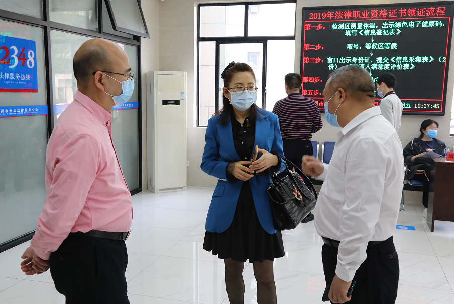 毛晓军一行先后到株洲市司法局和湘潭市司法局,认真听取了两地2019年法律职业资格证书现场颁发组织实施工作的有关情况汇报,实地查看了证书颁发现场候场区、工作区、隔离区的设置情况和防疫物资配备使用、场所定时消毒等情况。实地检查了工作人员与领证人员的防护措施是否到位,证书颁发场所设置、领证人员排队间隔距离以及人员流量控制是否合理得当等情况。还详细了解了领证人员检测流程、疫情防控期间应急处置保障等情况。