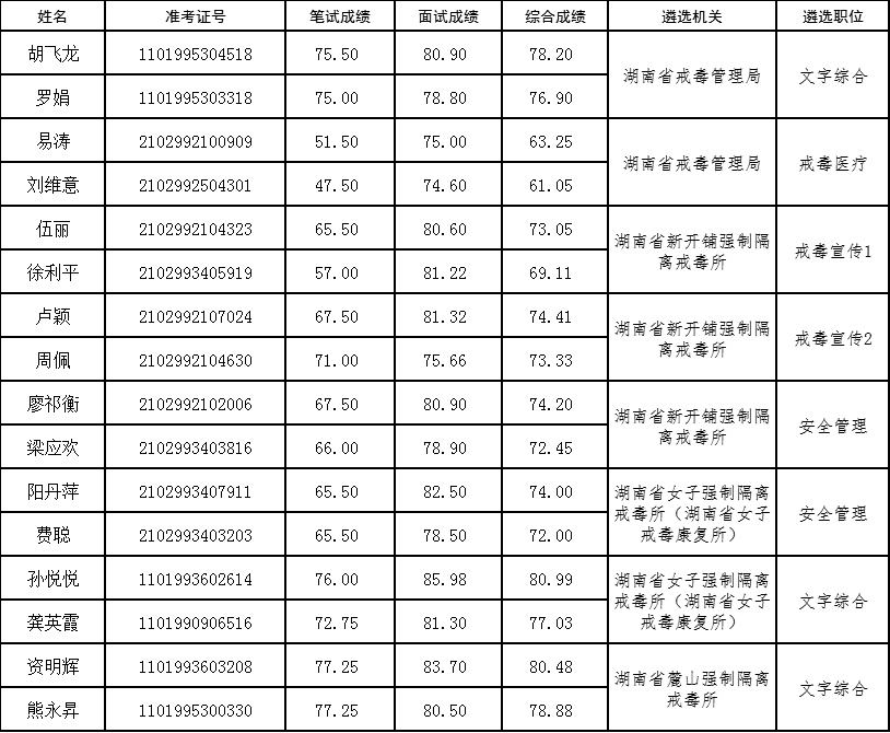 根据《2025年度湖南省省直机关公开遴选公务员公告》要求,省戒毒管理局(含省属戒毒单位)共8个公开遴选公务员岗位经笔试、资格复审、面试等程序,按照综合成绩从高分到低分的顺序,确定了差额体检与考察对象,现公告如下: