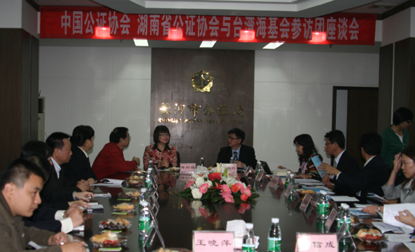 应中国公证协会邀请,台湾海基会一行10人在何武良处长为团长的带领下,10月20日至10月23日对我省公证工作进行了参访。10月21日湖南省公证协会与台湾海基会进行了亲切友好的座谈。会上湖南省公证协会会长、湖南省司法厅副厅长傅莉娟对台湾海基会公证业务参访团表示最真挚、最热烈的欢迎,希望今后台湾海基会能够更加关注和支持湖南涉台公证业务的发展,进一步加大交流合作的力度,丰富交流合作的内容,实现两地公证业共同繁荣。湖南省公证协会何忠禄秘书长具体介绍了我省公证业务发展状况。台湾海基会何武良处长详细介绍两岸涉台公证发展情况。其间,台湾海基会参访团还参观了长沙市长沙公证处、岳阳市湘北公证处。(厅公管处)