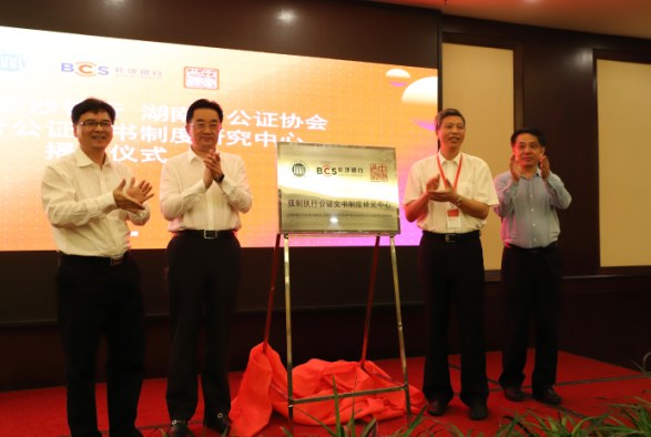 签约仪式上,湘潭大学法学院·知识产权学院副院长吴勇、长沙银行股份有限公司总审计师向虹、湖南省公证协会会长佘信群签署文件,三方共建强制执行公证文书制度研究中心。唐世月、廖迪文、廖永安、赵小中共同为中心揭牌。