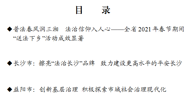 三、坚持贴近实际,提升普法质效。全省各地围绕农村实际和农民需求,采取各种方式开展丰富多彩的宣传活动,全省“送法下乡”活动取得显著成效。衡阳市司法局结合春节扶贫走访慰问,局机关结对帮扶责任人深入连点飞跃村19户帮扶对象,送去民法典台历、宪法读本、法治宣传折页,增强群众获得感。湘潭市湘潭县在花石镇花石村开展民法典知识趣味答题活动,通过答题发放小礼品的形式,吸引群众参与“送法下乡”活动,提高农村法治宣传的趣味性。常德市安乡县大力推行“互联网+农村法治宣传”模式,利用北有安乡APP“法治安乡”专栏开设“送法下乡”专题,浏览量超过2.5万人次,扩大了农村法治宣传覆盖面。张家界市桑植县司法局深入瑞塔铺镇老岩桥村,为新任村“两委”班子成员和党员举行民法典法治讲座,有效提高农村党员干部运用法治思维和法治方式推进工作的能力。益阳市桃江县守法普法工作办公室推动各县直单位和乡镇全面开展“送法下乡”活动,掀起农村普法新热潮。郴州市司法局联合北湖区守法普法工作办公室,组织区司法、人社、农业农村、市场监督管理等职能部门深入到华塘镇农贸圩场,开展春节期间“送法下乡”活动,为广大群众送去丰富的法治“节礼”。永州市江永县千家峒瑶族乡以农村留守儿童为重点,司法所和乡妇联联合开展“送法下乡”活动,向农村留守儿童传授未成年人保护法律知识和疫情防控常识,让就地过年的农村外出务工人员过一个安心祥和的新年。怀化市会同县司法局深入广坪镇场墟开展“送法下乡”活动,现场发放新法新规读本,解答群众法律咨询,赢得群众的认可。湘西州制作《民法典学法用法三字经》读本,利用“送法下乡”活动进行发放,通过三字经和漫画相结合的形式宣传民法典,让法律知识朗朗上口、通俗易懂。2021年“送法下乡”活动开展期间,全省各地共组织入户宣传24万多次,发放法治宣传资料240多万份,向群众赠送法治文化产品30多万份,各类新媒体推送信息20多万条,组织法治培训6000多场。