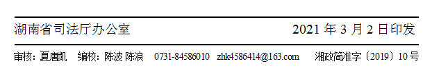 二、坚持示范引领,推动依法治理。2021年,省司法厅继续开展农村主题法治宣传集中示范活动,将集中示范点放在村一级,通过加强指导、支持普法活动经费、赠送法律书籍和法治文化产品、组织普法志愿者提供法律服务等方式,提高村级自治组织的积极性,发挥示范引领作用,带动全省农村法治宣传活动深入开展,有效推动法治乡村建设进程。省司法厅投入25万元普法经费,在长沙、株洲、岳阳、邵阳、娄底各选一个村(社区)开展“送法下乡”集中示范活动。长沙市望城区以“送法下乡”活动为载体,在靖港镇众兴社区建成高品质的民法典主题公园,结合开园仪式开展集中示范活动,营造浓厚的法治乡村建设氛围。株洲市集中5天时间在天元区雷打石镇伞铺村开展集中示范活动,市、区两级和伞铺村共同开展丰富多彩的农村普法活动,指导建设法治文化带,实现法治文化持续在乡惠乡。邵阳市以创建省级民主法治示范村为目标,以集中示范活动为契机,在邵阳县塘渡口镇蔡山团村建成法治文化长廊,帮助蔡山团村健全完善各项基层民主法治制度,有力推动法治乡村建设。岳阳市在平江县安定镇横冲村开展集中示范活动,省司法厅一级巡视员唐世月现场指导活动开展,并为该村颁发第八批全国民主法治示范村牌匾,进一步激发干部群众投身法治乡村建设的热情。娄底市充分协调市、县、镇、村四级共同开展活动,组织若干专业普法小分队,深入涟源市杨市镇板桥村派送新春法治“大礼包”,切实提高农村普法的实效性。