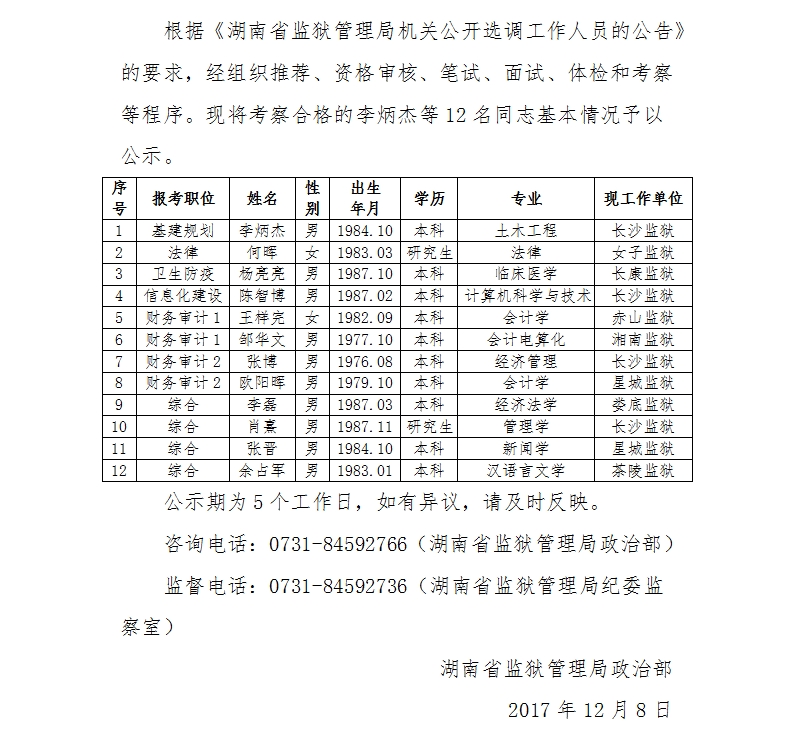 湖南省监狱管理局公开选调工作人员考察合格人员公示